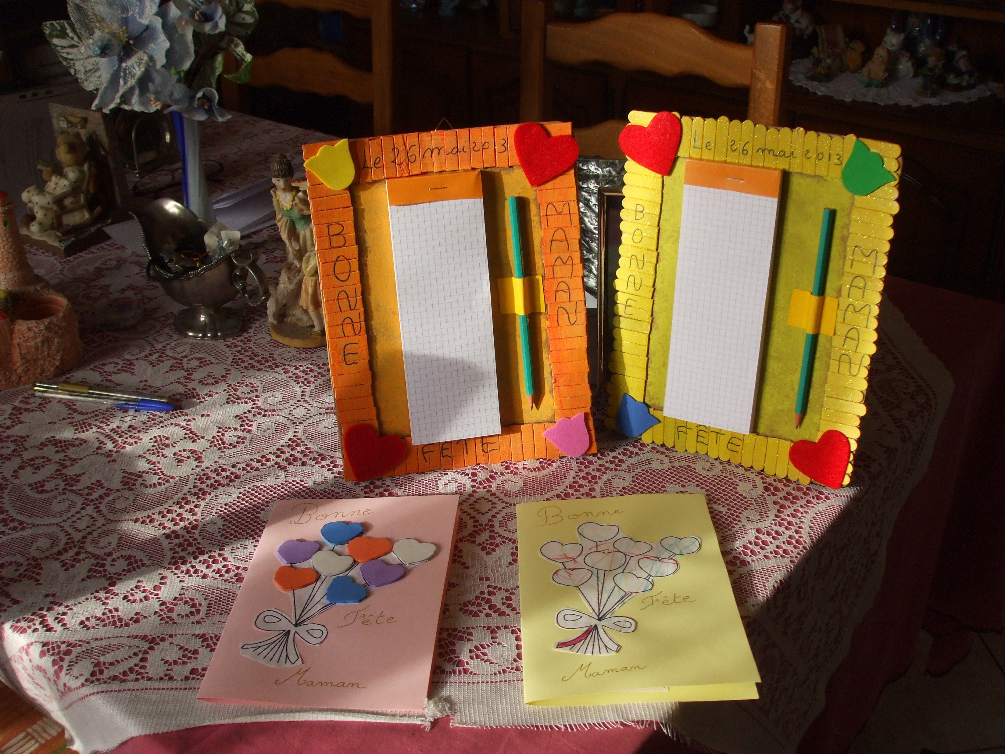 voici les cadeaux faits pour la fête des mères.Il s'agit d'un mémo réalisé à partir d'un carton épais sur lequel les enfants ont collé des morceaux de batonnets de glace qu'ils ont ensuite peint.Acela j'ai ajouté un bloc note et un crayon à papier.