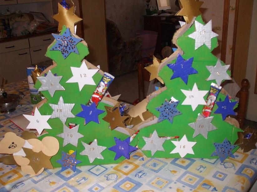 cette année nos sapin sont en forme de sapin rempli d'étoile à l'intérieur desquelles j'ai déposé des surprises pour les loulous(chocolats,voitures,ballons à gonfler...)ceux que vous voyez ci dessous sont ceux de valentin et d'alexandre:unface de chaque calendrier.